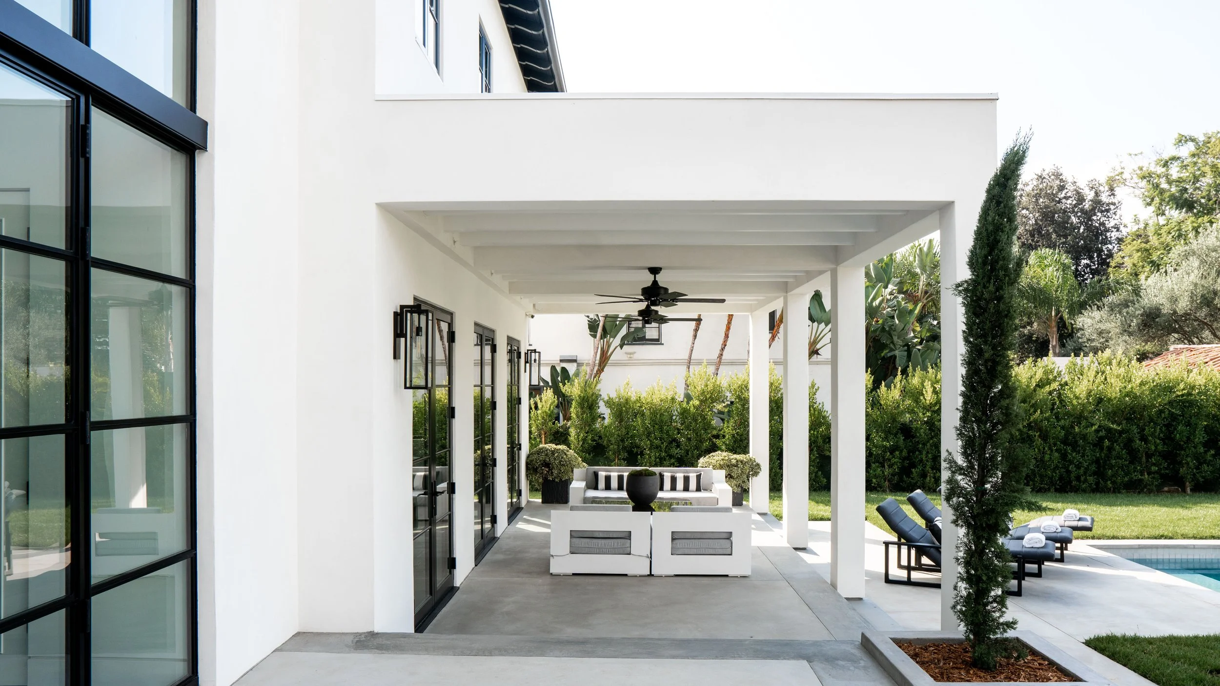 A historic home's exterior was preserved while the interior was reorganized around a new double-height foyer. Rooms on both levels flank this central space, with views extending from the front entry to the backyard. A new covered porch, pool, and landscaping expand the living area outdoors.