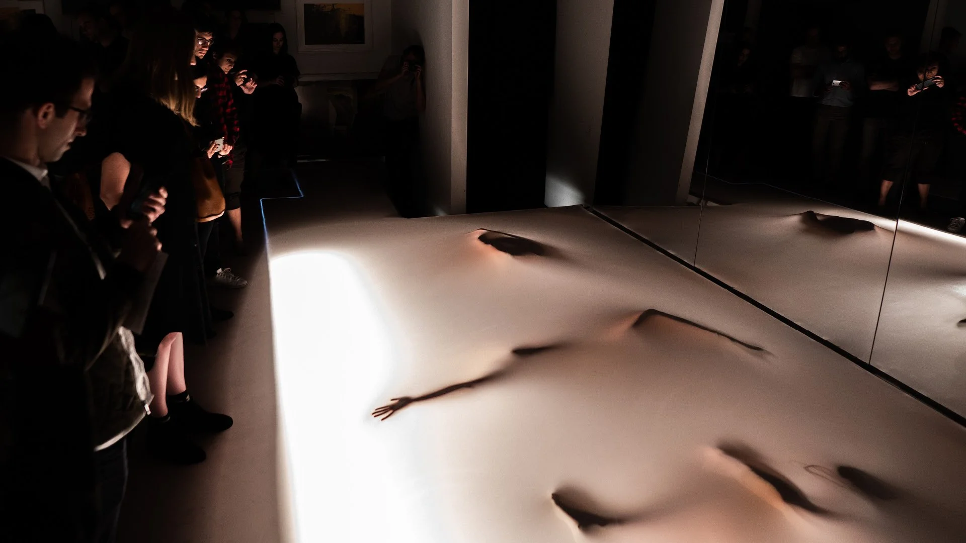 Contour reimagines the traditional vertical theater scrim as a horizontal surface beneath the audience. Dancers move across this scrim as images are projected onto it, causing the body, material, and projection to shift and merge. The scrim distorts into topographic shapes, encouraging viewers to explore how body, landscape, and drawing overlap.