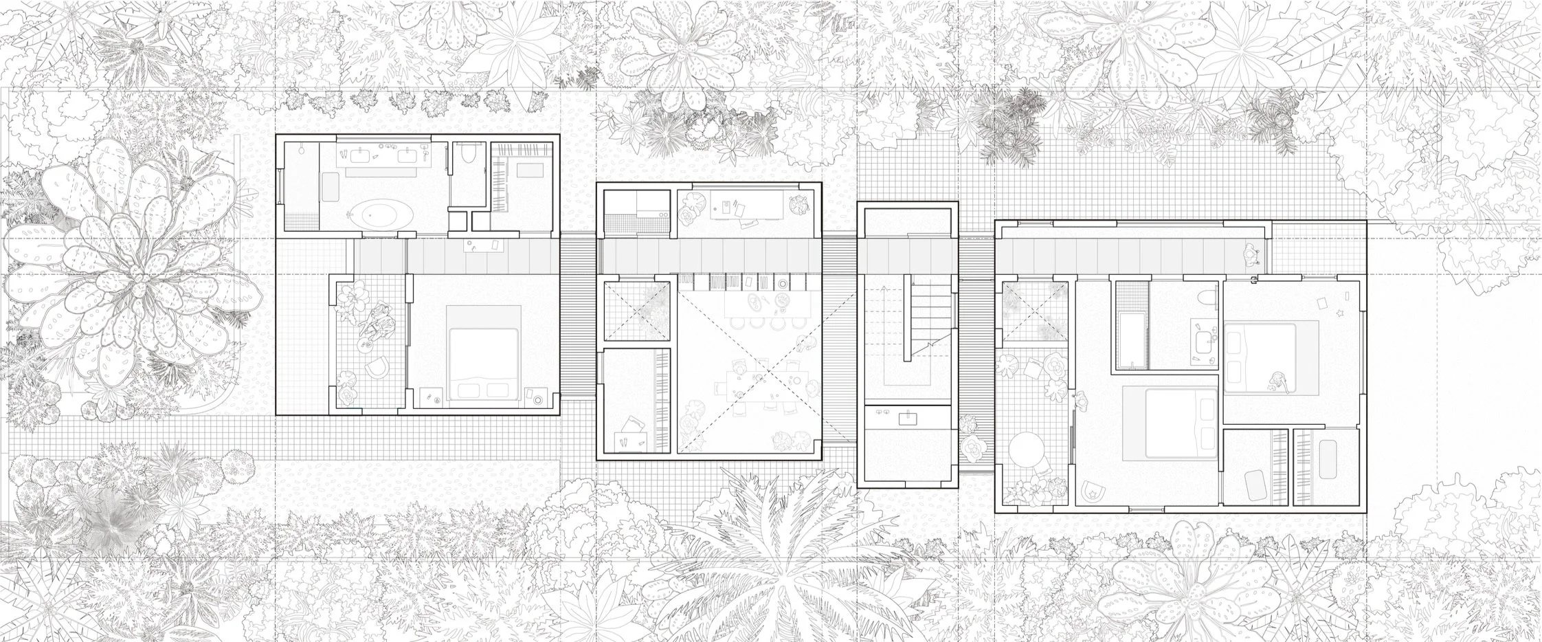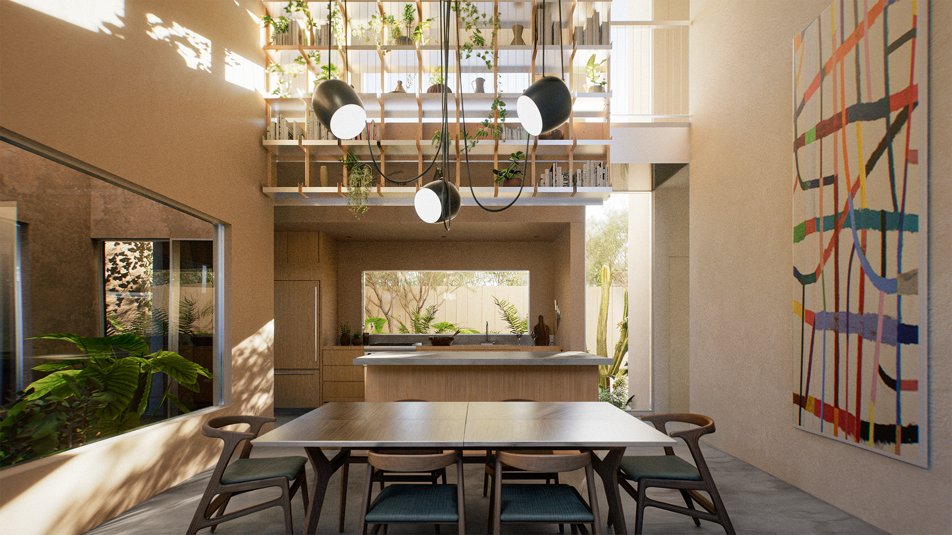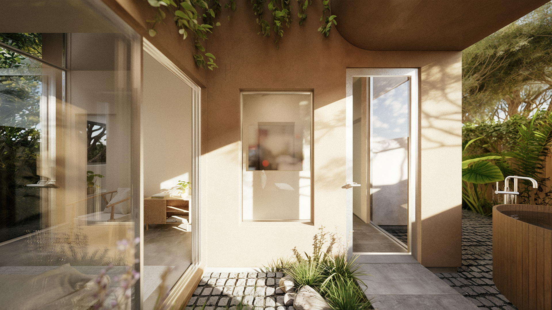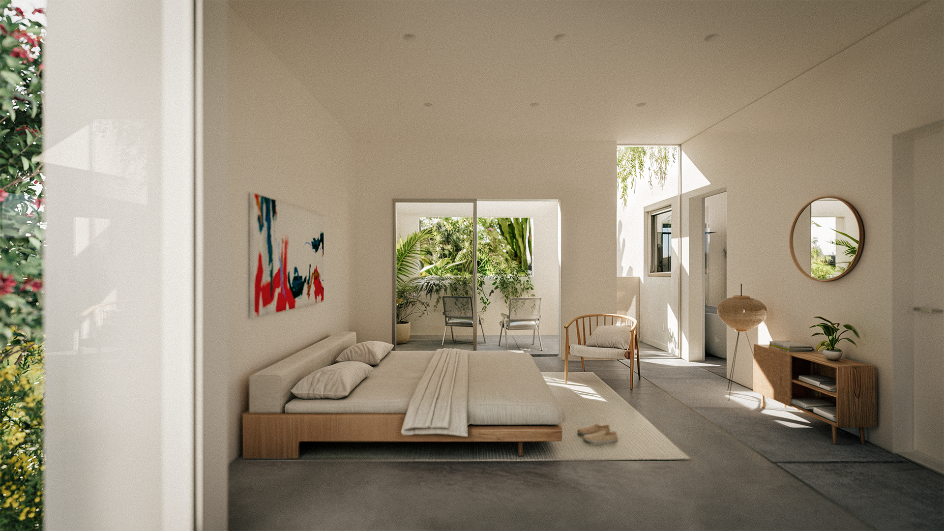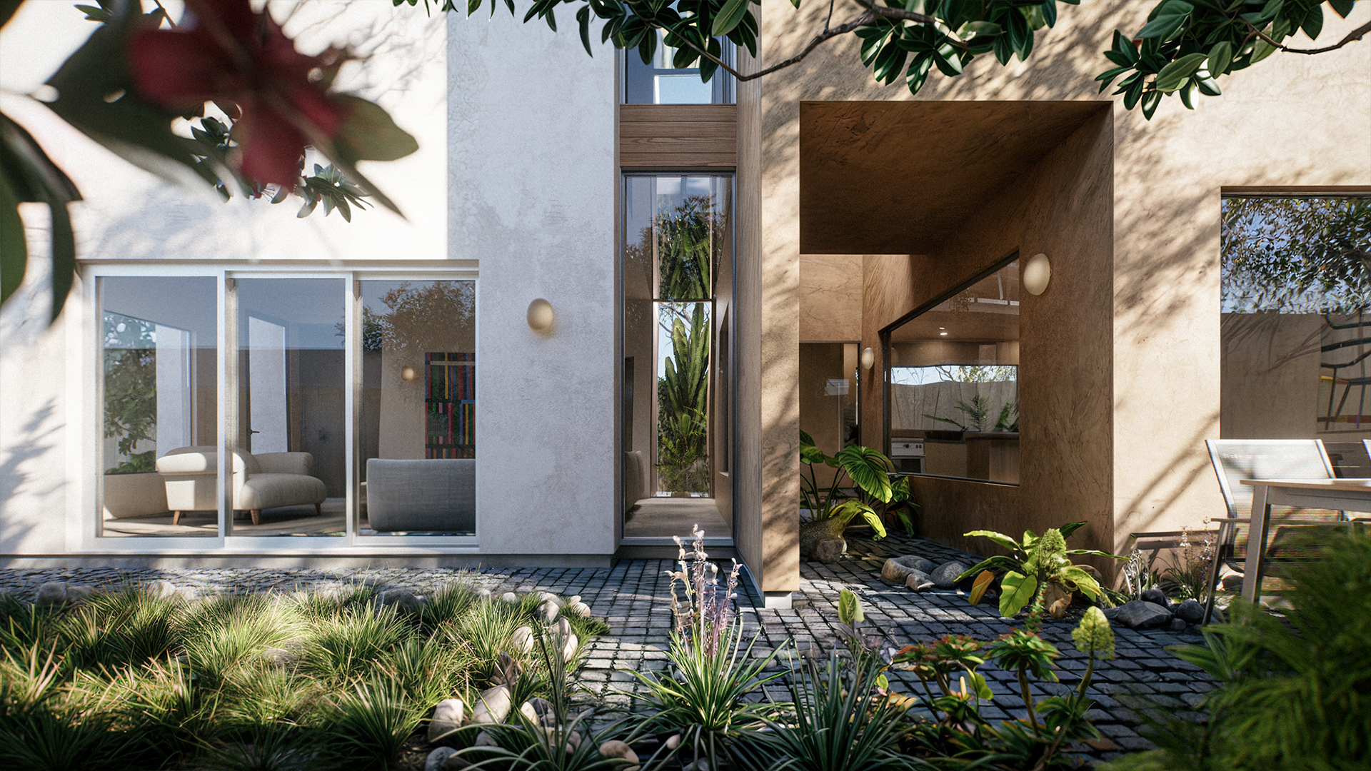 This two-story residence in Venice is organized around access to light, air, and outdoor space. Each primary room opens directly onto a courtyard or patio, extending the living spaces outward. Circulation runs along a defined axis, linking all spaces on each level. Floor-to-ceiling windows and mirrored ceilings introduce layered views and a visual illusion of landscaped gaps between adjacent rooms.